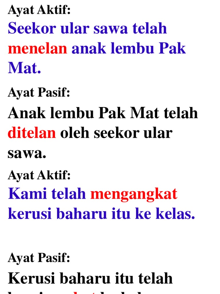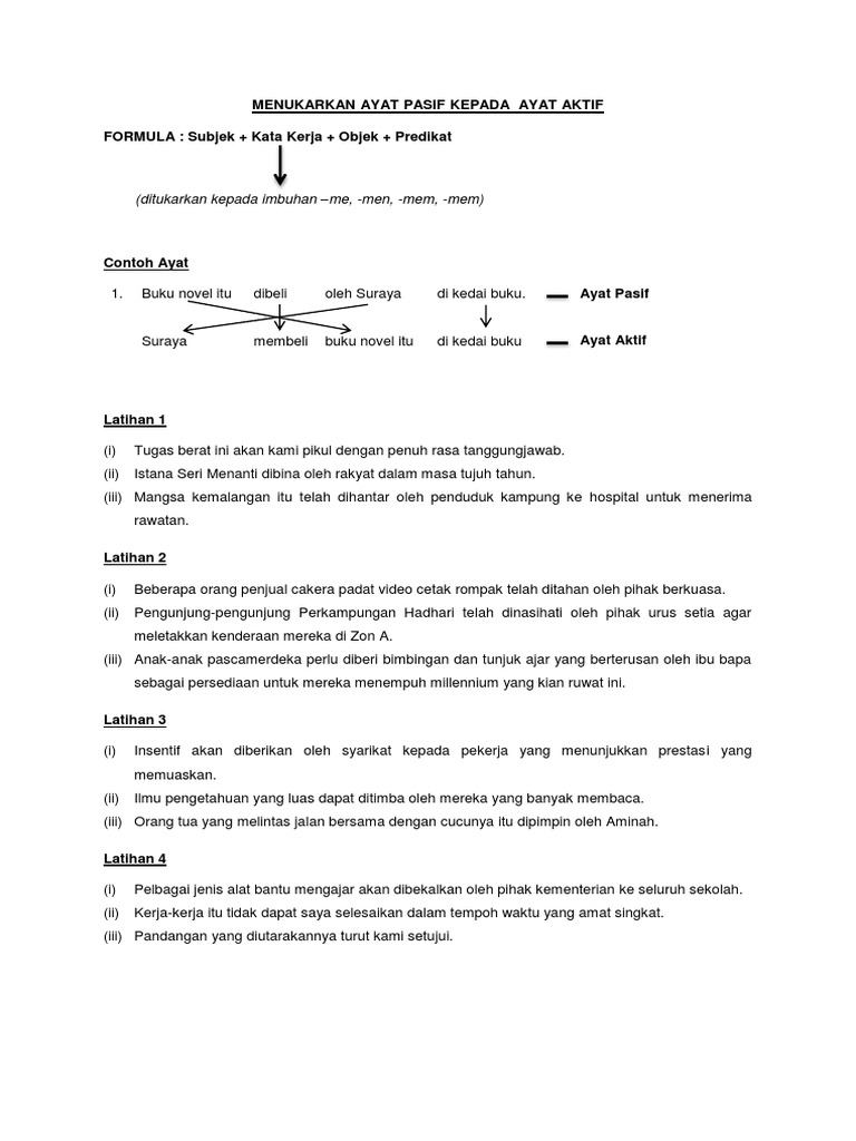 Tukar ayat pasif yang berikut kepada ayat akti tanpa mengubah maksud asalnya (tahun 2018). 20 comments on latihan ayat aktif dan ayat pasif. Mengenal pasti sama ada contoh ayat yang diberikan adalah ayat aktif atau ayat pasif. Ayat aktif ayat pasif & 2. Bahasa melayu sekolah rendah berfokus kepada menukarkan ayat aktif kepada ayat pasif diseiakan oleh cikgu roslina tarman.