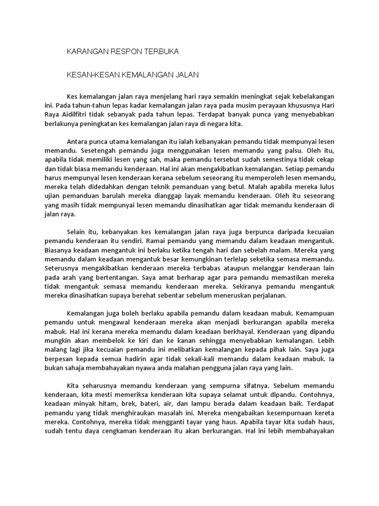Kesan Kemalangan Amir Syafiq Docx Karangan 1 Pt3 Kesan Kemalangan Jalan Raya Di Malaysia Akibat Kemalangan Boleh Meragut Banyak Nyawa Dan Kecederaan Course Hero from www.coursehero.com Kesan kesan kemalangan jalan raya 1. Ayat 1 (kesimpulan berserta ayat fokus) contoh ayat: Kematian di jalan raya sudah menjadi masalah negara yang menghantui kita setiap hari. Kemalangan jalan raya yang berlaku telah menyebabkan kecederaan, kematian serta kerosakan kenderaan yang terbabit. Namun, kesan kehilangan nyawa terhadap tenaga kerja dalam negara secara keseluruhannya perlu dipertimbangkan secara lebih mendalam. • keadaan cuaca panas akan menganggu emosi pengguna jalan raya dan penglihatan. Kenal pasti semua isi punca berlaku kemalangan jalan raya berdasarkan petikan ini. Karangan stpm cara menulis penutup / kesimpulan karangan 1.