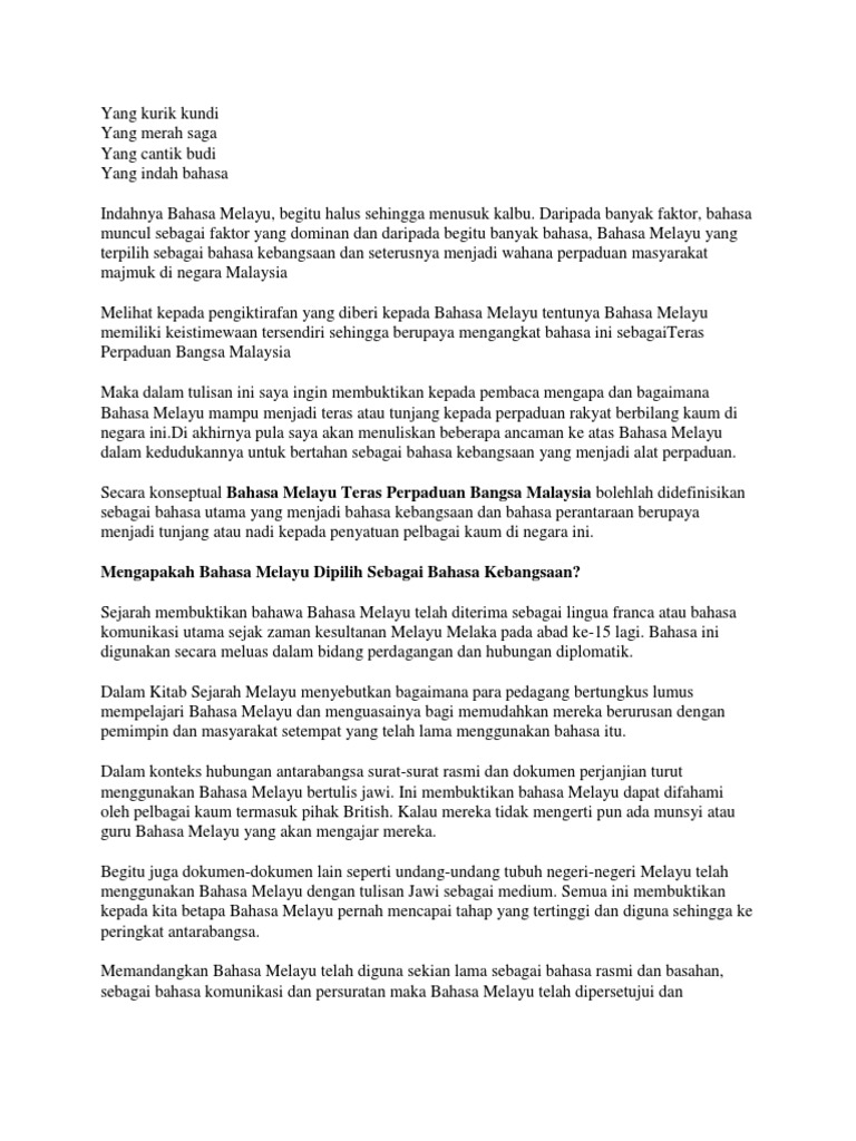 Bahasa melayu sebagai bahasa perpaduan. Atas dasar inilah bahasa melayu diangkat sebagai bahasa perpaduan iaitu bahasa yang mudah difahami oleh semua lapisan masyarakat tanpa ada rasa prasangka. Sewaktu disepakati, sumpah itu, terutama butir ketiga, berbunyi: Walaupun kedudukan bahasa melayu sudah terjamin sebagai bahasa kebangsaan,bahasa rasmi dan bahasa pengantar pendidikan dan dewan bahasa dan pustaka(dbp) peranan bahasa melayu sebagai bahasa ilmu dan juga asas perpaduan mulamenempuhi cabaranya yang tersendiri. Sejarah membuktikan bahawa bahasa melayu telah diterima sebagai lingua franca atau bahasa komunikasi utama sejak zaman kesultanan melayu bagaimanakah bahasa melayu boleh berfungsi secara berterusan sebagai bahasa perpaduan? 2.1 bahasa melayu sebagai bahasa perpaduan kaum. Nilai bahasa melayu, integriti asas budaya, pemupukan perpaduan, memperteguh kebudayaan kebangsaan, aspirasi perlembagaan negara, value of malay language, the basic integrity of culture, nurturing unity, reinforcing the national culture, aspirations of constitution. Memartabatkan bahasa melayu, memperkukuhkan bahasa inggeris, perpaduan kaum dan kemajuan negara. Indahnya bahasa melayu, begitu halus sehingga. Bahawa bahasa melayu mampu menjadi alat perpaduan. Menjunjung bahasa persatuan, bahasa indonesia. Penggunaan bahasa melayu yang semakin meluas sesuai dengan tarafnya sebagai bahasa kebangsaan dan bahasa rasmi negara menekankan aspek penting untuk menyatupadukan rakyat mengikut fungsi bahasa melayu sebagai bahasa perpaduan adalah melalui pendidikan. Bahasa ini wajib diketahui oleh setiap kaum kerana bahasa ini menjadi bahasa utama dalam konteks hubungan antara kaum.